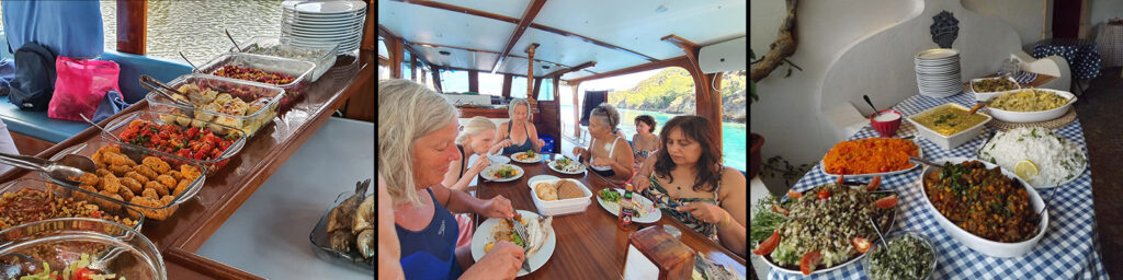 Many of the evening meals will be at Likya, who offer a lovely two course vegetarian meal, with a wide mezze spread for starters, (which are delicious and filling) and a main. There will be a fish option also available during the boat trip.
